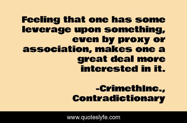 This page presents the quote "Feeling that one has some leverage upon something, even by proxy or association, makes one a great deal more interested in it.". Author of this quote is CrimethInc., Contradictionary. This quote is about anarchism, crimethinc, leverage, agency, proxy, anarchy, association,.