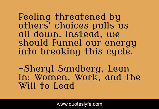 This page presents the quote "Feeling threatened by others' choices pulls us all down. Instead, we should funnel our energy into breaking this cycle.". Author of this quote is Sheryl Sandberg, Lean In: Women, Work, and the Will to Lead. .