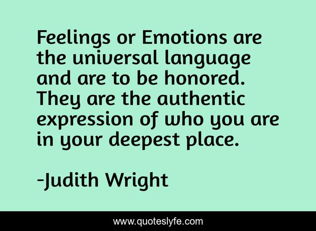 This page presents the quote "Feelings or Emotions are the universal language and are to be honored. They are the authentic expression of who you are in your deepest place.". Author of this quote is Judith Wright. This quote is about honored, language, expression, emotions, feelings, honor, who-you-are, authentic, deepest-place,.