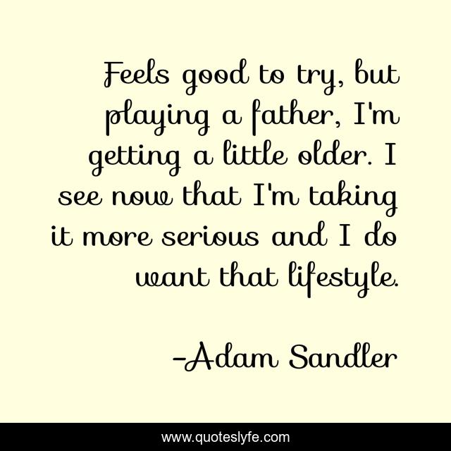 This page presents the quote "Feels good to try, but playing a father, I'm getting a little older. I see now that I'm taking it more serious and I do want that lifestyle.". Author of this quote is Adam Sandler. This quote is about good, father,.