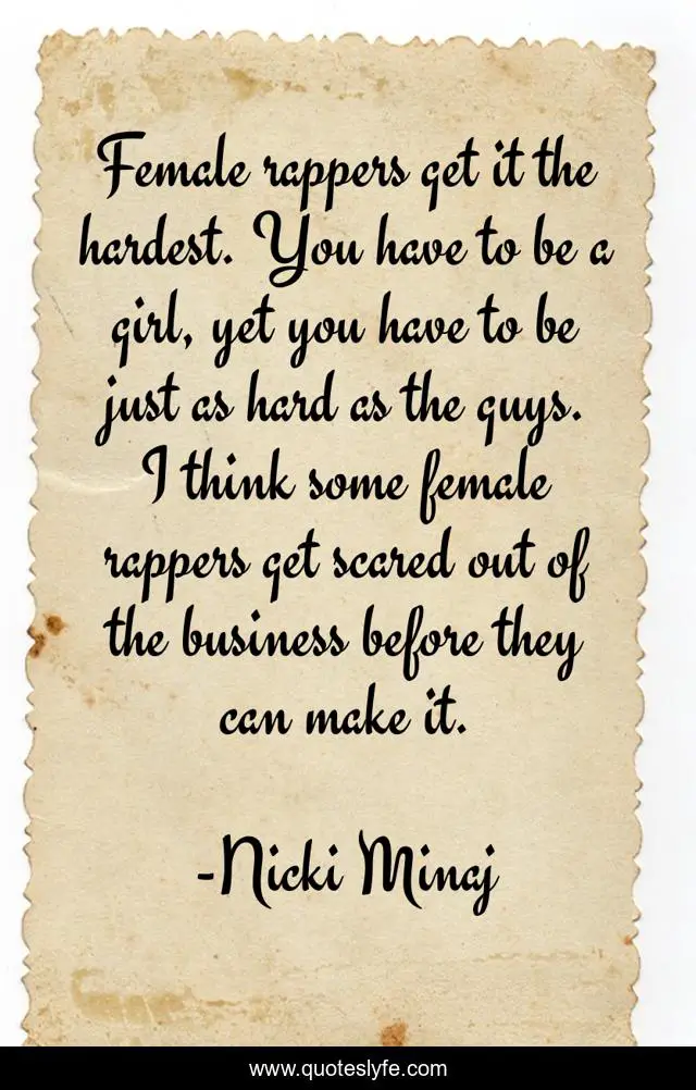 This page presents the quote "Female rappers get it the hardest. You have to be a girl, yet you have to be just as hard as the guys. I think some female rappers get scared out of the business before they can make it.". Author of this quote is Nicki Minaj. This quote is about girl, think,.