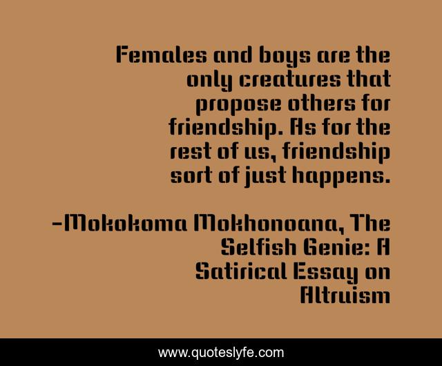 "Mokokoma Mokhonoana, The Selfish Genie: A Satirical Essay on Altruism Quotes." Quoteslyfe.com, 2025. Sun. 07 Dec. 2025. <https://www.quoteslyfe.com/quote/Females-and-boys-are-the-only-creatures-127616>.