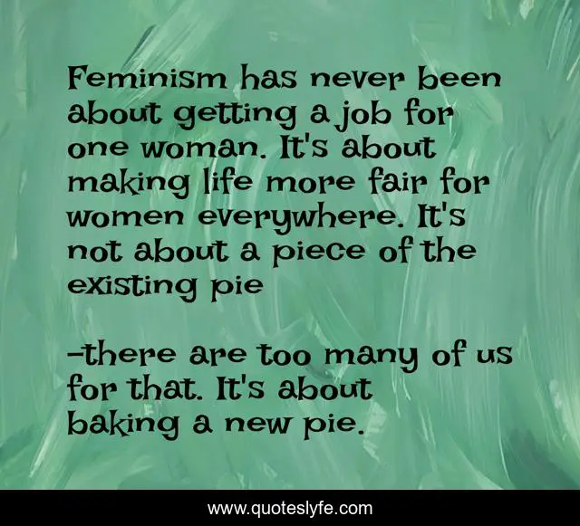 This page presents the quote "Feminism has never been about getting a job for one woman. It's about making life more fair for women everywhere. It's not about a piece of the existing pie". Author of this quote is there are too many of us for that. It's about baking a new pie.. .