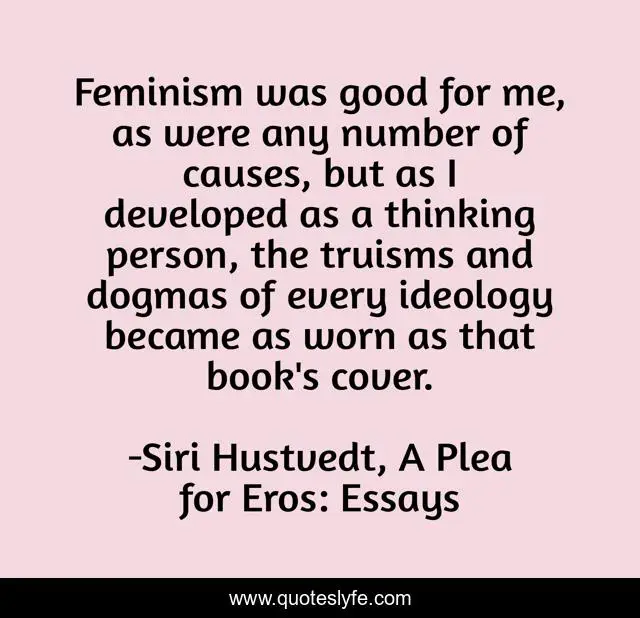 This page presents the quote "Feminism was good for me, as were any number of causes, but as I developed as a thinking person, the truisms and dogmas of every ideology became as worn as that book's cover.". Author of this quote is Siri Hustvedt, A Plea for Eros: Essays. .