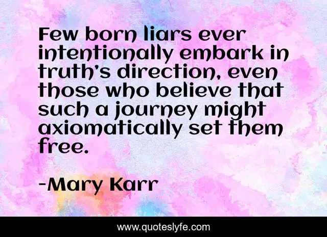This page presents the quote "Few born liars ever intentionally embark in truth’s direction, even those who believe that such a journey might axiomatically set them free.". Author of this quote is Mary Karr. This quote is about journey, lying,.