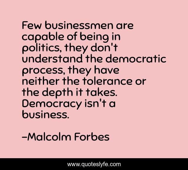 This page presents the quote "Few businessmen are capable of being in politics, they don't understand the democratic process, they have neither the tolerance or the depth it takes. Democracy isn't a business.". Author of this quote is Malcolm Forbes. This quote is about business, democracy,.