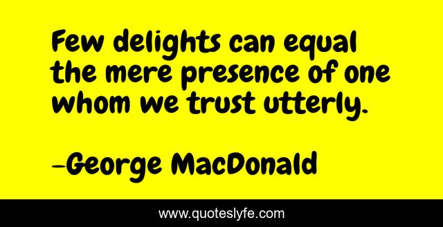 This page presents the quote "Few delights can equal the mere presence of one whom we trust utterly.". Author of this quote is George MacDonald. This quote is about delight, trust, presence,.