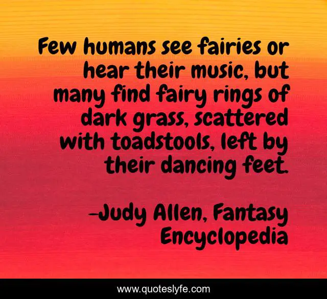 This page presents the quote "Few humans see fairies or hear their music, but many find fairy rings of dark grass, scattered with toadstools, left by their dancing feet.". Author of this quote is Judy Allen, Fantasy Encyclopedia. This quote is about fairies, humor, fiction,.