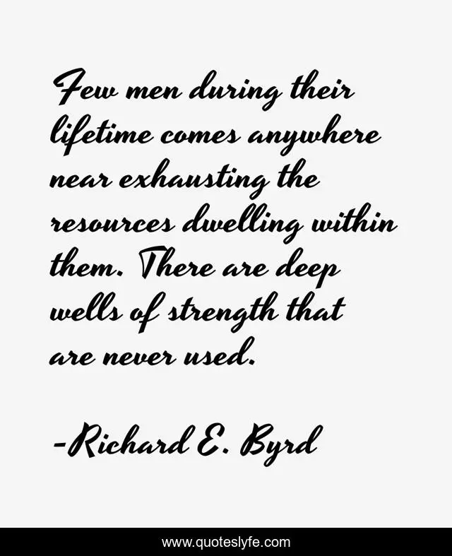 This page presents the quote "Few men during their lifetime comes anywhere near exhausting the resources dwelling within them. There are deep wells of strength that are never used.". Author of this quote is Richard E. Byrd. This quote is about men, deep, resources,.