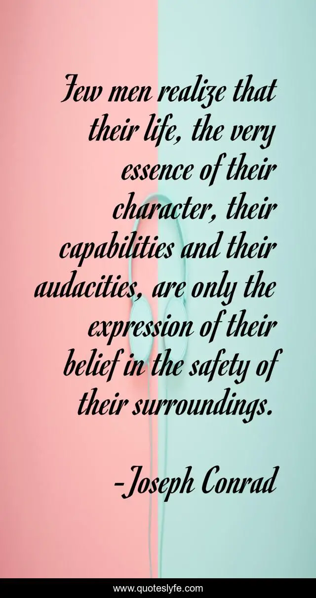 This page presents the quote "Few men realize that their life, the very essence of their character, their capabilities and their audacities, are only the expression of their belief in the safety of their surroundings.". Author of this quote is Joseph Conrad. .