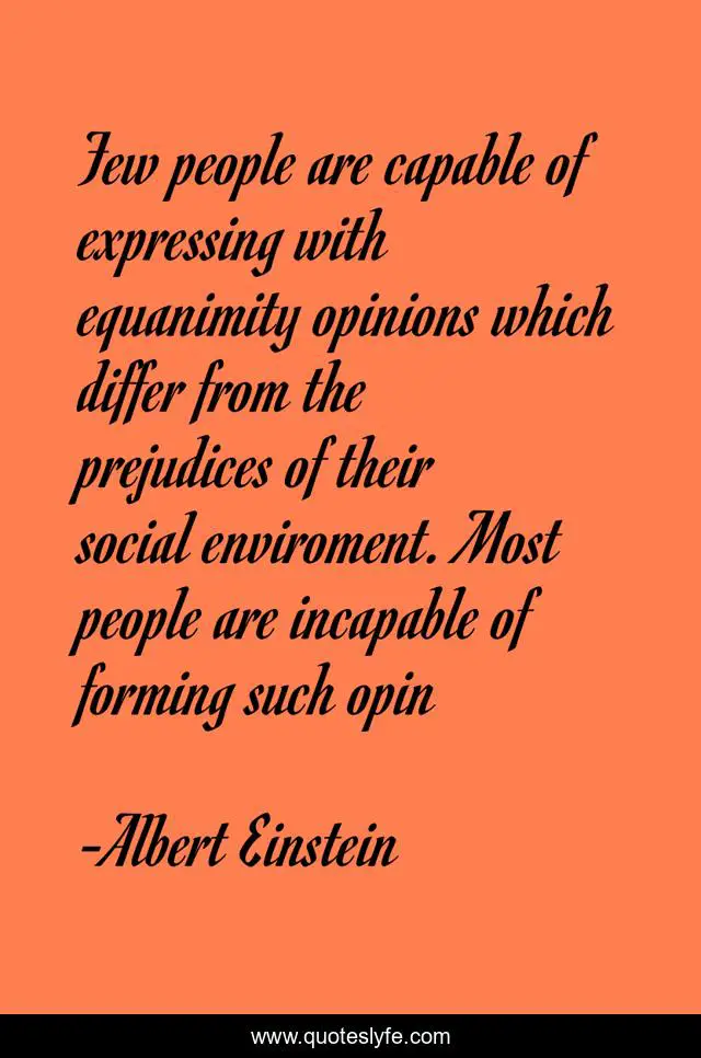 This page presents the quote "Few people are capable of expressing with equanimity opinions which differ from the prejudices of their social enviroment. Most people are incapable of forming such opin". Author of this quote is Albert Einstein. This quote is about opinions, knowledge, equanimity, dissent, disagreement, prejudices, thought, society, expressing,.