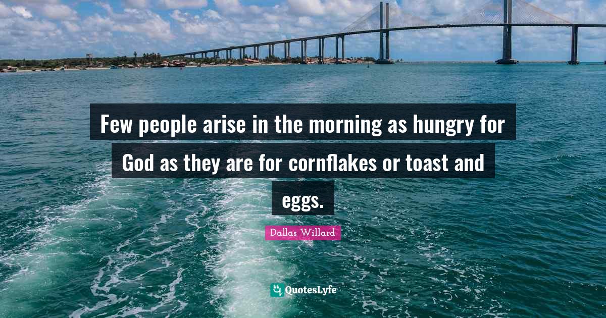 This page presents the quote "Few people arise in the morning as hungry for God as they are for cornflakes or toast and eggs.". Author of this quote is Dallas Willard. This quote is about food, hungry, god, people, arise, eggs, morning,.