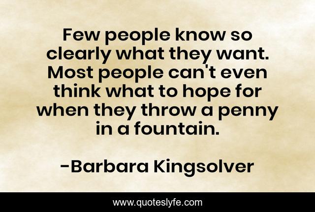 This page presents the quote "Few people know so clearly what they want. Most people can't even think what to hope for when they throw a penny in a fountain.". Author of this quote is Barbara Kingsolver. .