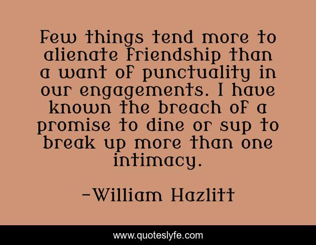 This page presents the quote "Few things tend more to alienate friendship than a want of punctuality in our engagements. I have known the breach of a promise to dine or sup to break up more than one intimacy.". Author of this quote is William Hazlitt. This quote is about intimacy, up,.