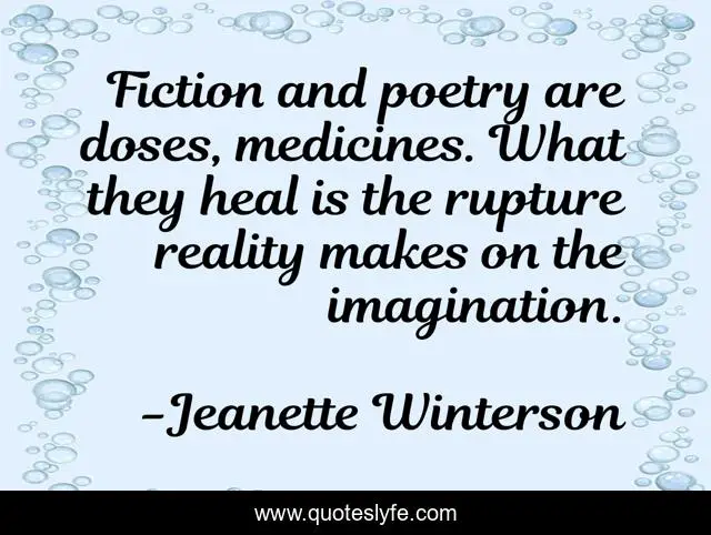 This page presents the quote "Fiction and poetry are doses, medicines. What they heal is the rupture reality makes on the imagination.". Author of this quote is Jeanette Winterson. This quote is about imagination, poetry, fiction,.