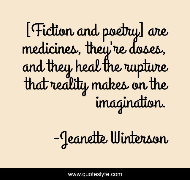 This page presents the quote "[Fiction and poetry] are medicines, they're doses, and they heal the rupture that reality makes on the imagination.". Author of this quote is Jeanette Winterson. This quote is about poems, reading, books, poetry, fiction,.