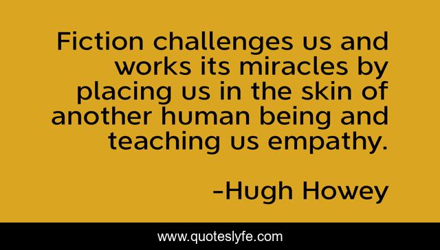 This page presents the quote "Fiction challenges us and works its miracles by placing us in the skin of another human being and teaching us empathy.". Author of this quote is Hugh Howey. This quote is about miracles, empathy, fiction,.
