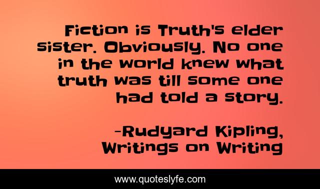 This page presents the quote "Fiction is Truth's elder sister. Obviously. No one in the world knew what truth was till some one had told a story.". Author of this quote is Rudyard Kipling, Writings on Writing. This quote is about truth, fiction,.