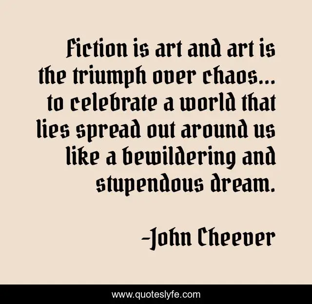 This page presents the quote "Fiction is art and art is the triumph over chaos… to celebrate a world that lies spread out around us like a bewildering and stupendous dream.". Author of this quote is John Cheever. This quote is about fiction, books, inspirational, enthusiasm, writing, on-fiction,.