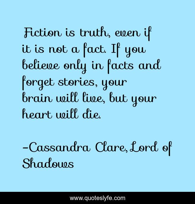 This page presents the quote "Fiction is truth, even if it is not a fact. If you believe only in facts and forget stories, your brain will live, but your heart will die.". Author of this quote is Cassandra Clare, Lord of Shadows. This quote is about facs, life, truth, fiction,.