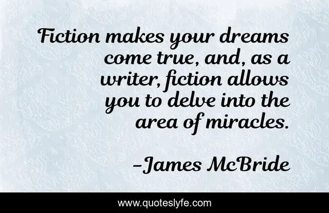 This page presents the quote "Fiction makes your dreams come true, and, as a writer, fiction allows you to delve into the area of miracles.". Author of this quote is James McBride. This quote is about your dreams, true,.