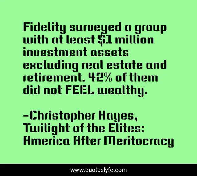 This page presents the quote "Fidelity surveyed a group with at least $1 million investment assets excluding real estate and retirement. 42% of them did not FEEL wealthy.". Author of this quote is Christopher Hayes, Twilight of the Elites: America After Meritocracy. This quote is about contentment, greed, materialism,.