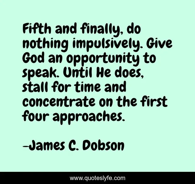 This page presents the quote "Fifth and finally, do nothing impulsively. Give God an opportunity to speak. Until He does, stall for time and concentrate on the first four approaches.". Author of this quote is James C. Dobson. This quote is about give, impulsively, god, to, concentrate, time, do-nothing, stall, opportunity,.