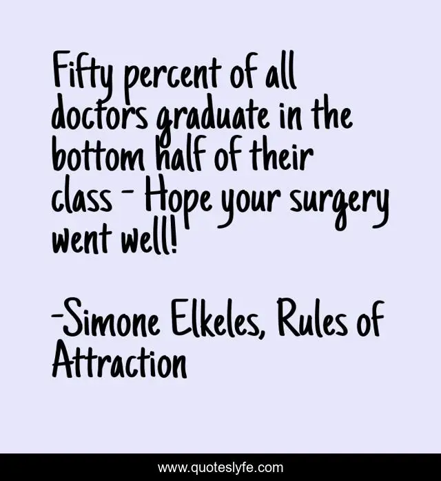 This page presents the quote "Fifty percent of all doctors graduate in the bottom half of their class - Hope your surgery went well!". Author of this quote is Simone Elkeles, Rules of Attraction. .