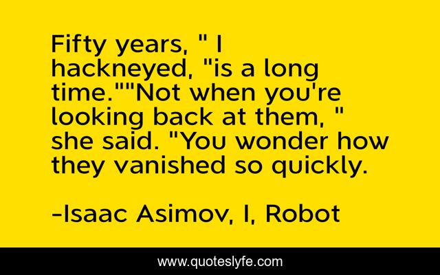 This page presents the quote "Fifty years, " I hackneyed, "is a long time.""Not when you're looking back at them, " she said. "You wonder how they vanished so quickly.". Author of this quote is Isaac Asimov, I, Robot. .