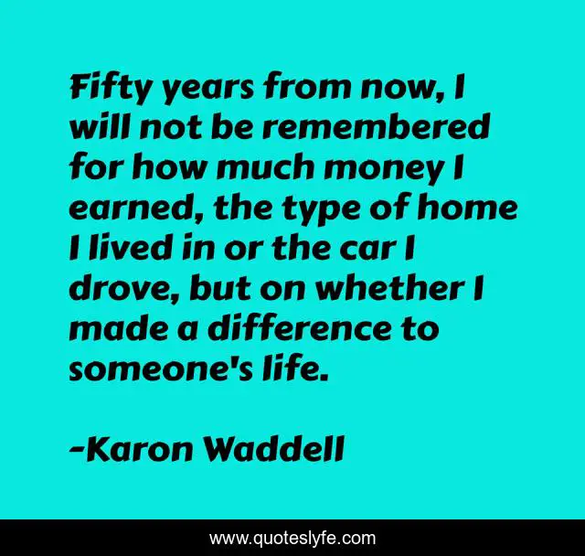 This page presents the quote "Fifty years from now, I will not be remembered for how much money I earned, the type of home I lived in or the car I drove, but on whether I made a difference to someone's life.". Author of this quote is Karon Waddell. This quote is about life, difference, remembered, inspirational, inspirational-life, enthusiasm, life-and-living,.