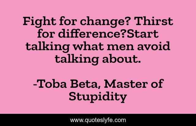 This page presents the quote "Fight for change? Thirst for difference?Start talking what men avoid talking about.". Author of this quote is Toba Beta, Master of Stupidity. This quote is about difference, thirsty, fight, start-talking, taboo, avoidance, change,.