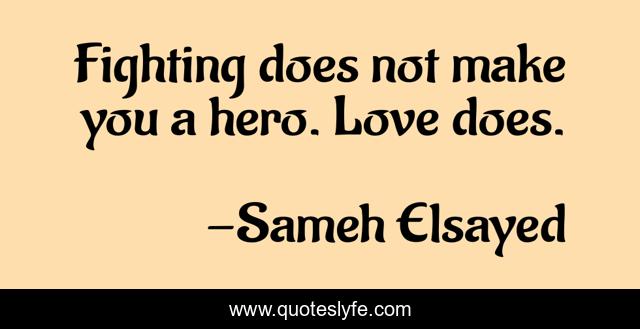 This page presents the quote "Fighting does not make you a hero. Love does.". Author of this quote is Sameh Elsayed. This quote is about experience-plus, love, adam-elsayedtood, fighting, noha-abdel-hameed, joumana-ezz, hero, affection, sameh-elsayed,.