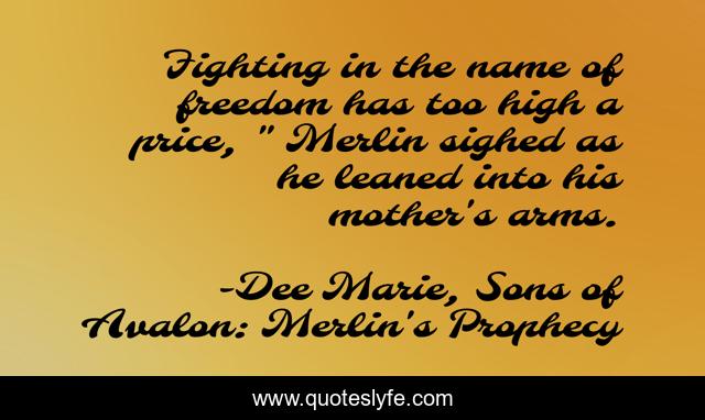 This page presents the quote "Fighting in the name of freedom has too high a price, " Merlin sighed as he leaned into his mother's arms.". Author of this quote is Dee Marie, Sons of Avalon: Merlin's Prophecy. This quote is about politics, avalon, merlin, arthurian, wisdom,.
