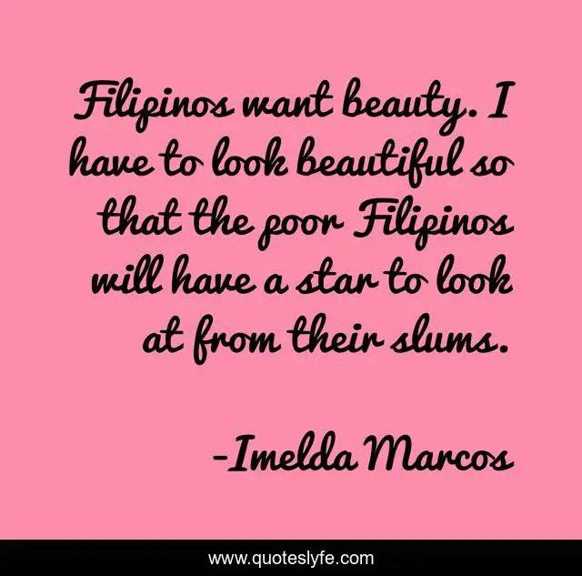 "Imelda Marcos Quotes." Quoteslyfe.com, 2025. Mon. 08 Dec. 2025. <https://www.quoteslyfe.com/quote/Filipinos-want-beauty-I-have-to-look-316630>.