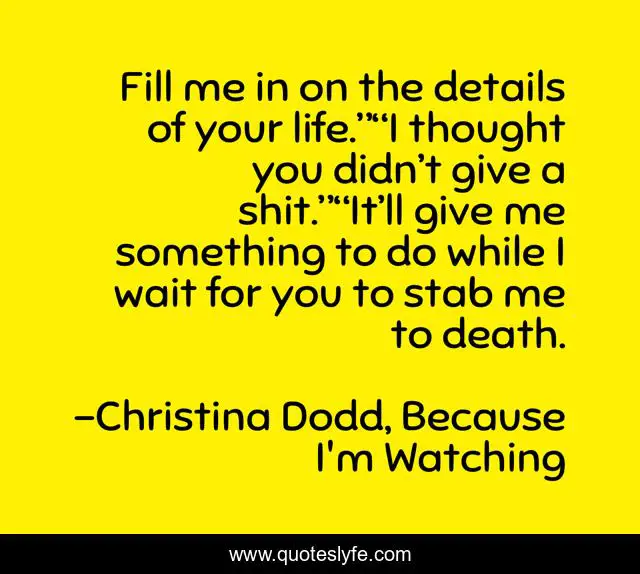 "Christina Dodd, Because I'm Watching Quotes." Quoteslyfe.com, 2025. Sun. 07 Dec. 2025. <https://www.quoteslyfe.com/quote/Fill-me-in-on-the-details-of-200588>.