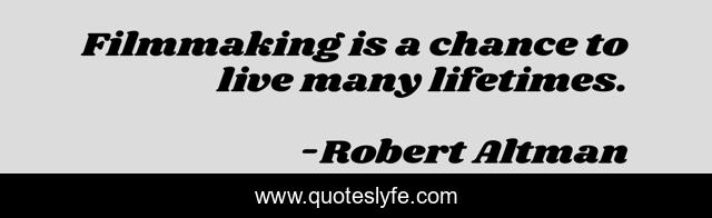 This page presents the quote "Filmmaking is a chance to live many lifetimes.". Author of this quote is Robert Altman. This quote is about movies, live, filmmaking,.