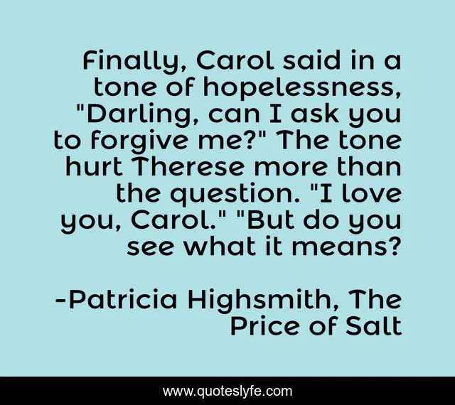 Finally, Carol said in a tone of hopelessness, "Darling, can I ask you to forgive me?" The tone hurt Therese more than the question. "I love you, Carol." "But do you see what it means?