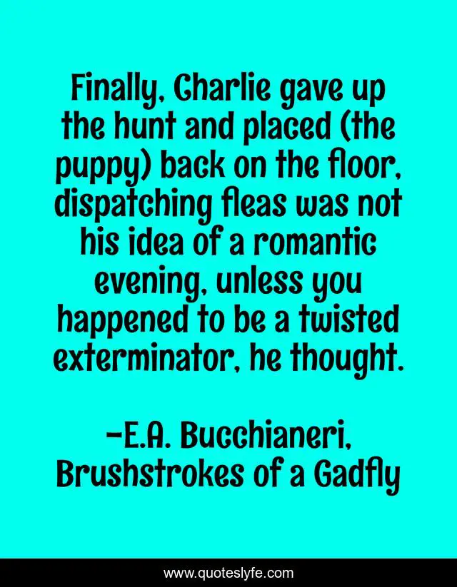 This page presents the quote "Finally, Charlie gave up the hunt and placed (the puppy) back on the floor, dispatching fleas was not his idea of a romantic evening, unless you happened to be a twisted exterminator, he thought.". Author of this quote is E.A. Bucchianeri, Brushstrokes of a Gadfly. This quote is about funny, fleas, romance-gone-wrong, animals, pests, humour, humor, dates, bloodsuckers,.