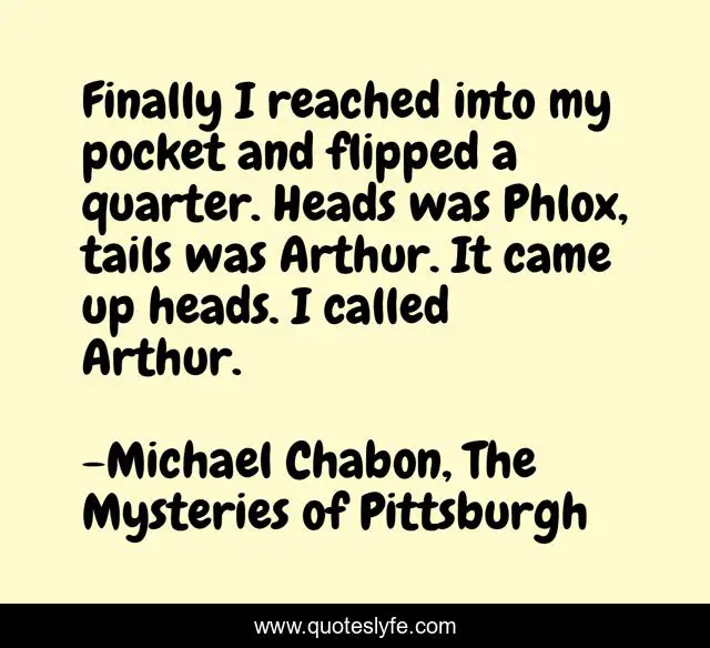 This page presents the quote "Finally I reached into my pocket and flipped a quarter. Heads was Phlox, tails was Arthur. It came up heads. I called Arthur.". Author of this quote is Michael Chabon, The Mysteries of Pittsburgh. This quote is about decisions, life, love, affection,.