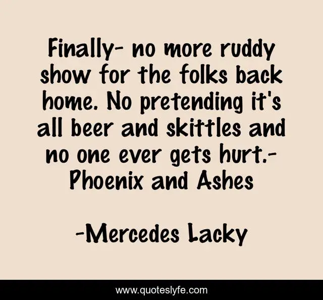 This page presents the quote "Finally- no more ruddy show for the folks back home. No pretending it's all beer and skittles and no one ever gets hurt.- Phoenix and Ashes". Author of this quote is Mercedes Lacky. This quote is about humor, thoughts-on-war, sad,.