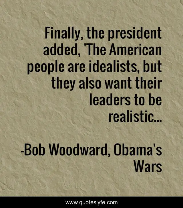 This page presents the quote "Finally, the president added, 'The American people are idealists, but they also want their leaders to be realistic...". Author of this quote is Bob Woodward, Obama's Wars. This quote is about idealists, american, leadership, obama-s-wars, president, bob-woodward,.
