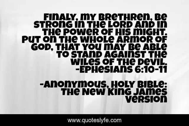 This page presents the quote "Finaly, my brethren, be strong in the Lord and in the power of His might. Put on the whole armor of God, that you may be able to stand against the wiles of the devil. -Ephesians 6:10-11". Author of this quote is Anonymous, Holy Bible: The New King James Version. This quote is about religion, bible,.