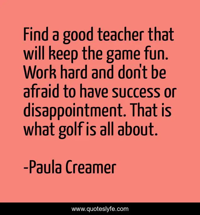 This page presents the quote "Find a good teacher that will keep the game fun. Work hard and don't be afraid to have success or disappointment. That is what golf is all about.". Author of this quote is Paula Creamer. This quote is about good, teacher, success,.