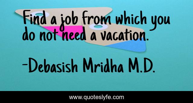 This page presents the quote "Find a job from which you do not need a vacation.". Author of this quote is Debasish Mridha M.D.. This quote is about job-stress, philosophy, debasish-mridha, vacation, quotes, job, inspirational, enthusiasm, debasish-mridha-m-d,.