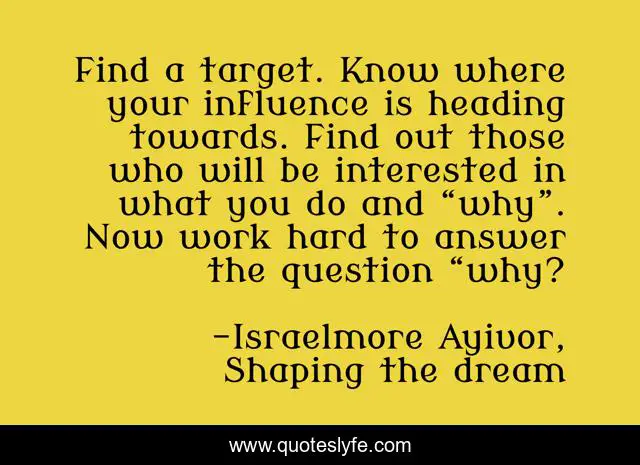 "Israelmore Ayivor, Shaping the dream Quotes." Quoteslyfe.com, 2025. Fri. 05 Dec. 2025. <https://www.quoteslyfe.com/quote/Find-a-target-Know-where-your-influence-129551>.