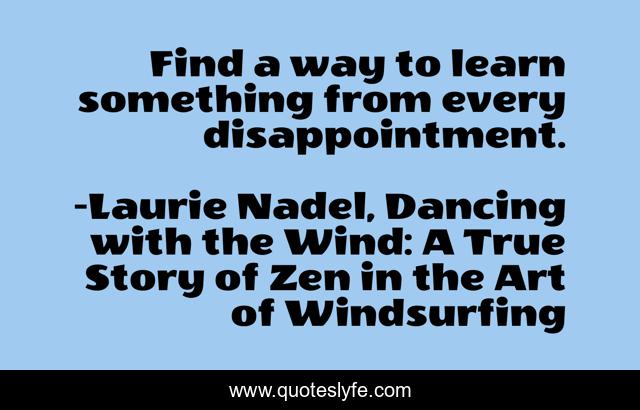 This page presents the quote "Find a way to learn something from every disappointment.". Author of this quote is Laurie Nadel, Dancing with the Wind: A True Story of Zen in the Art of Windsurfing. This quote is about learning-from-mistakes, quote-of-the-day, inspirational, dan-rather, wayne-dyer, disappointment, learning, quote-about-life, enthusiasm,.