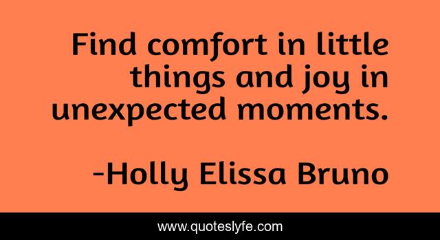This page presents the quote "Find comfort in little things and joy in unexpected moments.". Author of this quote is Holly Elissa Bruno. This quote is about joy, living-in-the-present, second-chances,.