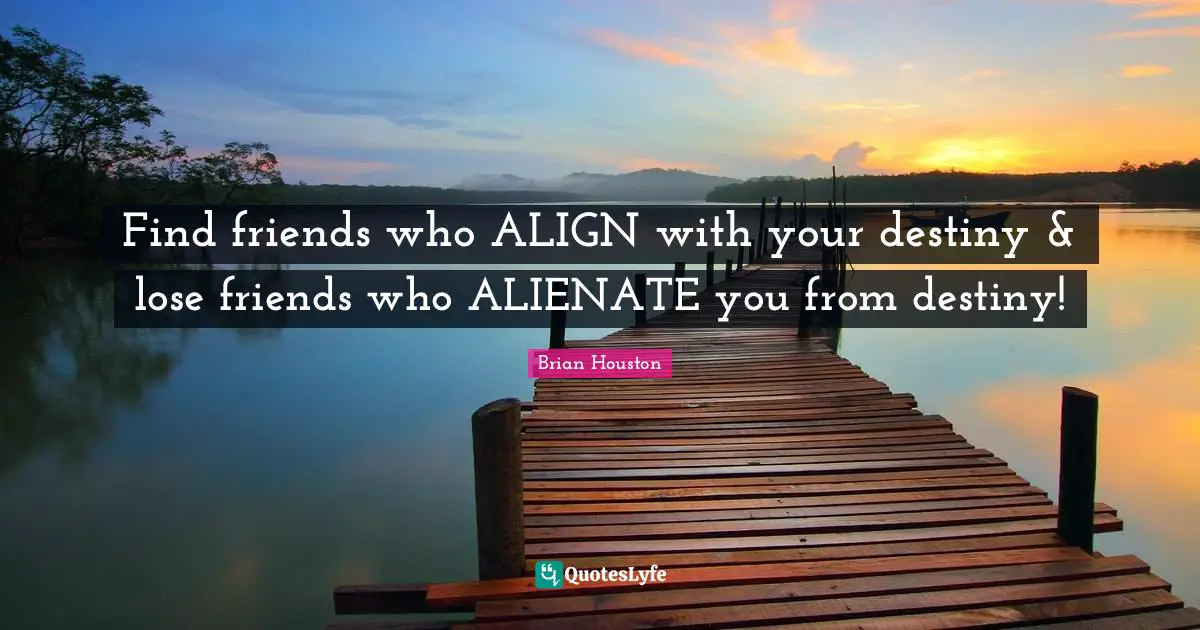This page presents the quote "Find friends who ALIGN with your destiny & lose friends who ALIENATE you from destiny!". Author of this quote is Brian Houston. This quote is about your destiny, friends, our destiny, destiny,.