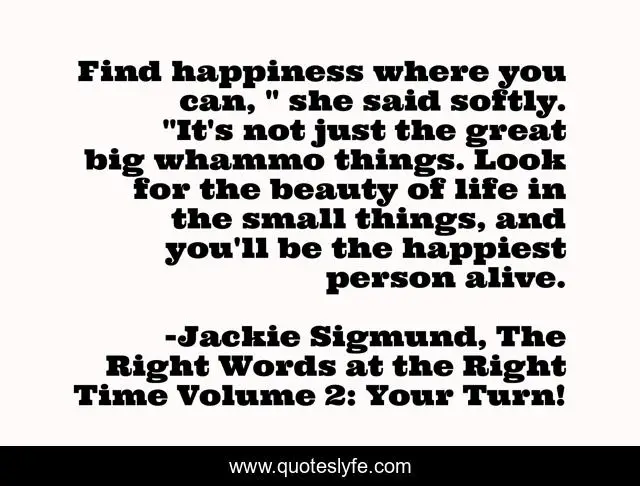 This page presents the quote "Find happiness where you can, " she said softly. "It's not just the great big whammo things. Look for the beauty of life in the small things, and you'll be the happiest person alive.". Author of this quote is Jackie Sigmund, The Right Words at the Right Time Volume 2: Your Turn!. This quote is about enthusiasm, happiness, inspirational,.