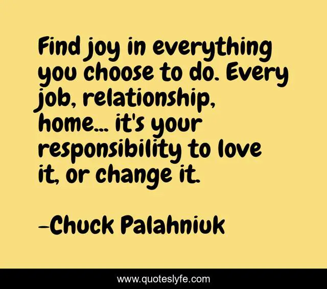 This page presents the quote "Find joy in everything you choose to do. Every job, relationship, home... it's your responsibility to love it, or change it.". Author of this quote is Chuck Palahniuk. .